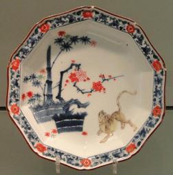 | Keywords: Decagonal Plate with Tiger and Tree Design, c. 1680-1700, Arita, hard-paste porcelain with overglaze enamels - Gardiner Museum, Toronto - DSC00586.JPG Exhibit in the Gardiner Museum Toronto Ontario Canada This artwork is in the public domain because the artist died more than 70 years ago Photography was permitted in the museum without restriction Daderot 2012-10-16 14 36 02 Daderot cc0 cc0 Japanese pottery in the Gardiner Museum Decagonal plates Tigers on plates Tigers in Japanese art Tigers in art in the 17th-century |