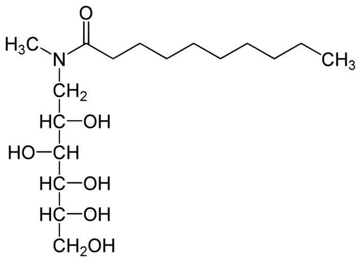 Keywords: Decanoyl-N-methylglucamide.svg en decanoyl-N-methylglucamide; Mega-10; N-Oxodecyl meglumine de Decanoyl-N-methylglucamid own Yikrazuul 12 12 09 Saturated fatty acids Amino sugars