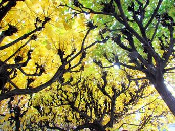Keywords: deciduous forest yellow autumn october bright forest green leaves back light