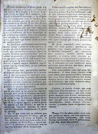 | Keywords: Declaración de igualdad a los indígenas del Río de la Plata 02.jpg es Declaración de igualdad a los indígenas por parte de la Junta Grande las Provincias Unidas del Río de la Plata en 1811 El documento está redactado en español y quechua 1811 Archivo General de la Nación Argentina Junta de Gobierno de las Provincias Unidas del Río de la Plata other versions Custom license marker 2015 09 19 PD-old-100 1811 in Argentina 1811 documents Colonial history of Argentina United Provinces of Río de la Plata Quechuan languages Indigenous peoples of Argentina Uploaded with UploadWizard |