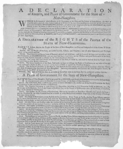 | Keywords: Declaration of Rights New Hampshire.jpg en A Declaration of Rights and Plan of Government for the State of New-Hampshire Broadsheet printed at Exeter New Hampshire by Zechariah Fowle in 1779 carrying statement by John Langdon president of the state convention 5 June 1779 http //memory loc gov/cgi-bin/query/r ammem/rbpe field DOCID+ lit rbpe08801500 The Library of Congress Washington D C http //memory loc gov/rbc/rbpe/rbpe08/rbpe088/08801500/001dr jpg State of New Hampshire John Langdon President of Convention ; Zechariah Fowle printer 1779 History of New Hampshire Exeter New Hampshire PD-old-100 |