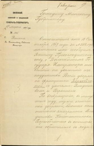 Keywords: Decree of the Vilno General-Governor Peter Albedinski to Minsk Governor - 2 March 1876 AD.jpg en Decree of the Vilno General-Governor Peter Albedinski to Minsk Governor first page Signed March 2 1876 AD in Vilno city Russian empire ru Сообщение виленского г одненского и ковенского гене ал-губе нато а минскому г ажданскому губе нат у о возв ащении на одину из эмиг ации и ссылке в Кост омскую губе нию участника восстания вольноп актикующего докто а г овог удка Владислава Бо зобогатого и о подаче его женой Ф антишкой п ошения о п инятии ее с детьми Владиславом и Ве оникой в оссийское подданство Издан в г Вильнюс Российская Импе ия 2 ма та 1876 г be Паведамленне віленскага г одзенскага і ковенскага гене ал-губе ната а мінскаму г амадзянскаму губе нат у аб вя танні на адзіму з эміг ацыі і ссылцы ў Каст амскую губе ню удзельніка паўстання вольнап актыкуючага докта а г аваг удка Уладзіслава Ба забагатага і аб падачы яго жонкай Ф анцішкай п ашэння аб п ыняцці яе з дзецьмі Уладзіславам і Ве анікай у асійскае падданства Выдадзены ў г Вільня Расійская Імпе ыя 2 сакавіка 1876 г National historical archive of Belarus Minsk Belarus the Vilno General-governorship office 1876 Уладзіслаў Бо забагаты Northwestern Krai PD-old