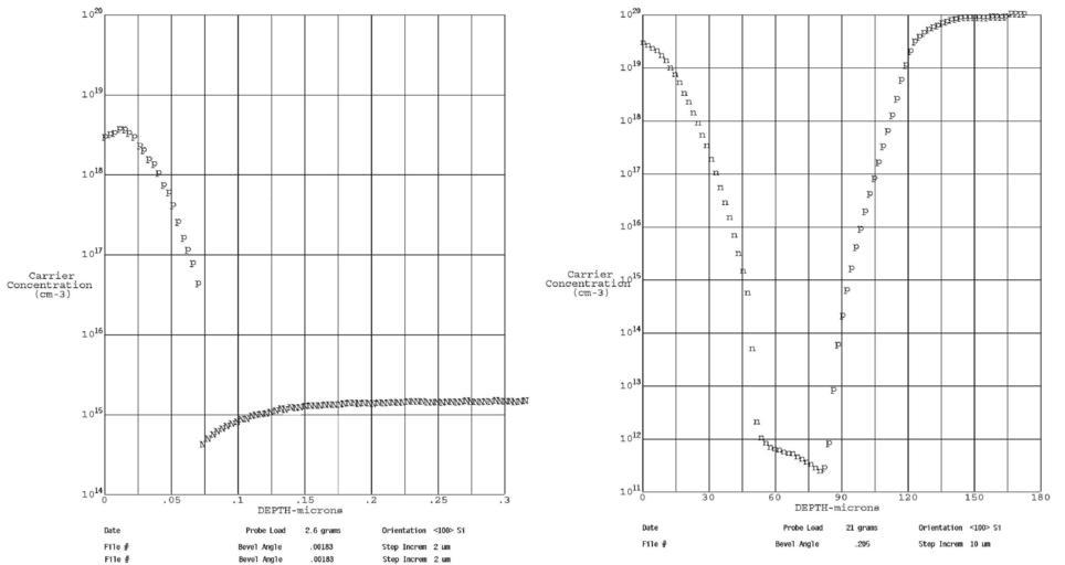 | Keywords: Deep and Shallow SR profiles.jpg en The shallow profile on the left the deep profile on the right Carrier concentration is plotted against depth Regions with a net electron concentration are denoted as n or n-type Regions with a net hole concentration are denoted as p Own Rogerprocessengineer 11/20/08 Semiconductor physics |