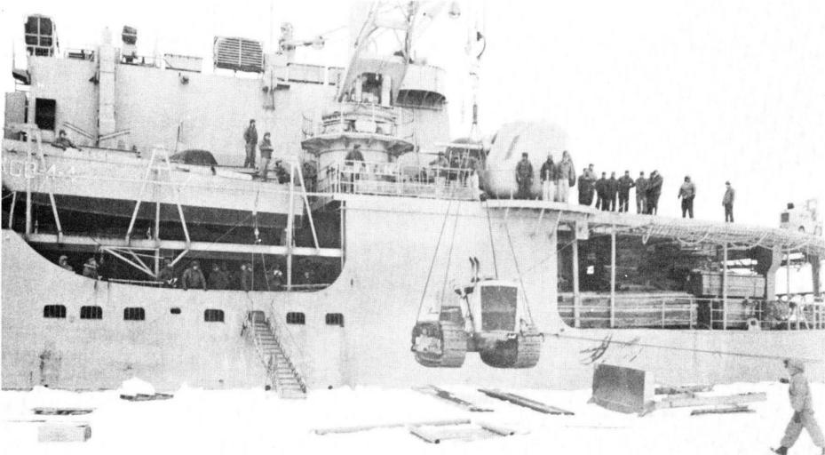 | Keywords: Deepfreeze I 473a.jpg Torque converter caterpillar D-8 tractor being unloaded by USS Glacier at McMurdo Sound Tractor as shown weighed approximately 24 tons Rated boom capacity of Glacier was 12 tons Report of Operation DEEPFREEZE I 1955-56 U S Navy Task Force 43 Washington D C 843 pp 1956 United States Navy Original work of the US Federal Government - public domain PD-USGov Operation Deep Freeze I USS Glacier AGB-4 Caterpillar D8 | ||||