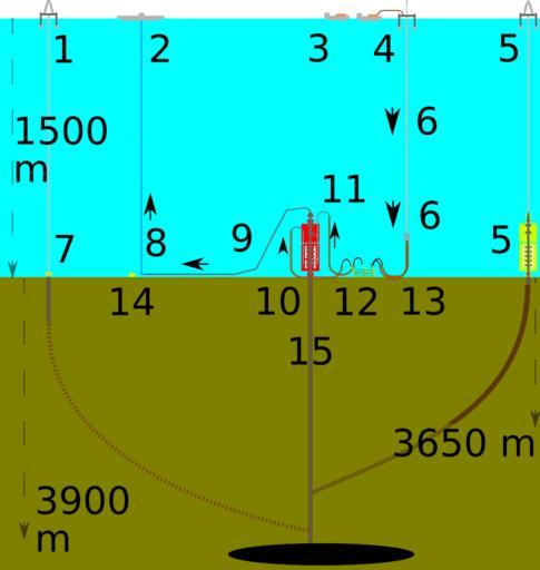 | Keywords: Deepwater Horizon oil spill recovery context numbered.svg en contextual overview of the Deepwater Horizon oil spill recovery area showing both sea surface and subsea Scale has been altered for clarity and only the main equipment is shown At the centre is a subsea blowout preventer stack installed on the seabed with a riser insertion tube in place to its left and kill and choke lines connected to a top kill mud manifold to its right Relief wells 1 and 2 are shown at the extreme right and left each drilling down to meet the blown centre well Legend red represents the blowout preventer stack grey represents the oil flow passage see 15 9 and 8 white tubing represents the kill left 10 and choke right 11 lines brown represents the top of the subsea well casing above 15 the five grey rectangles within the lower red shape represent ram-type blowout preventers the two grey rectangles within the upper red shape represent annular-type blowout preventers the orange pipes are flexible hoses connected to various rigid pipes above 10 12 and 13 Key 1 Relief Well 2 Development Driller II 2 Discoverer Enterprise 3 Kill mud ships 4 Top Kill Helix Q4000 5 Relief Well 1 Development Driller III 6 Mud pumped down by Helix Q4000 7 Relief Well 2 being drilled by Development Driller II 8 Riser Insertion Tube riser to sea surface 9 broken riser from top of blowout preventer BOP 10 Kill line into BOP 11 Choke line into BOP 12 Manifold for kill mud 13 Flexible hose interconnecting the mud pipes and manifold 14 Subsea Dispersion Injection System at end of broken riser 15 Oil well head Own illustration created with approximate reference to the following sources http //www offshore-mag com/index/article-display/323550/articles/offshore/equipment-engineering/us-gulf-of-mexico/cameron-wins-evo-subsea-bop-stack-contract html BP technical briefing linked at http //www offshore-mag com/index/article-display/5210928327/articles/offshore/deepwater-horizon/deepwater-horizon14 html Kent Wells technical update video linked at http //bp concerts com/gom/kentwells_update24052010 htm especially the illustration at time 6 54 BBC diagram at http //news bbc co uk/2/hi/world/us_and_canada/10159626 stm Economist diagram at http //media economist com/images/images-magazine/2010/21/ST/201021STC294 gif Using Inkscape 0 47 2010-05-30 User 84user thumb left Large context with large text font thumb left Large context with largest practical font size thumb left Large context numbered instead of text thumb left Subsea blowout preventer stack with top kill mud lines shown unattached thumb left stack with top kill mud lines attached thumb left stack set up for a top kill plus riser insertion tube thumb left stack in top kill mode plus riser insertion tube and kill mud manifold thumb left large context with small font showing both sea surface and subsea validSVG http //validator w3 org/check uri Created with Inkscape Oceanographic diagrams Blowout preventers Deepwater Horizon oil spill Language-neutral diagrams |