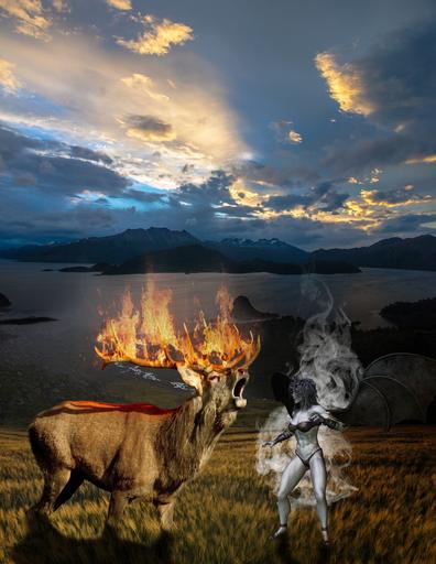 Keywords: deer fire burn flame smoke sunset sky mountain animal landscape nature wildlife elk clouds vampire fantasy outdoors