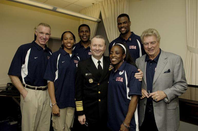 | Keywords: Defense.gov News Photo 060406-N-0696M-015.jpg en Vice Chairman of the Joint Chiefs of Staff Adm Edmund G Giambastiani Jr U S Navy poses for photos with members of Team USA in the Pentagon in Arlington Va on April 6 2006 The basketball superstars are in the Pentagon to hold a special basketball clinic for children of deployed and active duty military members as part of April's National Month of the Military Child From left are Chris Mullin Chasity Melvin Buck Williams Giambastiani Ruthie Bolton David Robinson and Chuck Daly 060406-N-0696M-015 Navy http //www defense gov/photos/newsphoto aspx newsphotoid 7855 2006-04-06 en Petty Officer 1st Class Chad J McNeeley U S Navy PD-USGov-Military-Navy Defense gov news media for April 2006 Import by User Slick-o-bot/Defense gov News Photos Edmund P Giambastiani Taken with Nikon D2X Chasity Melvin Chris Mullin basketball David Robinson Chuck Daly Buck Williams Ruthie Bolton |