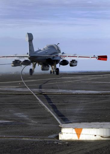 Keywords: Defense.gov News Photo 051117-N-9742R-004.jpg en An EA-6B Prowler aircraft catches one of the four arresting wires on the flight deck of the aircraft carrier USS Enterprise CVN 65 as the ship conducts flight operations in the Atlantic Ocean on Nov 17 2005 Enterprise and its embarked Carrier Air Wing 1 are underway in the Atlantic to conduct tailored ship's training The all-weather Prowler provides protection for strike aircraft ground troops and ships by jamming enemy radar electronic data links communications and obtains tactical electronic intelligence within the combat area 051117-N-9742R-004 Navy http //www defense gov/photos/newsphoto aspx newsphotoid 7342 2005-11-17 en Petty Officer 3rd Class Milosz Reterski U S Navy PD-USGov-Military-Navy Defense gov news media for November 2005 Import by User Slick-o-bot/Defense gov News Photos Grumman EA-6 Prowler aircraft carrier landings Taken with Nikon D2X USS Enterprise CVN-65 EA-6B Prowler US Marine Corps |