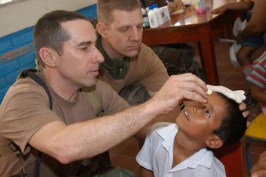 | Keywords: Defense.gov News Photo 050310-N-1159B-101.jpg  en Navy Nurse Lt William Jansak left applies eye drops to a young Nicaraguan boy during a Medical Readiness Training Exercise in Palo Grande Chinandega Nicaragua on March 10 2005 Jansak is attached to the Operational Health Support Unit Great Lakes Ill and is deployed to Nicaragua as part of New Horizons 2005 a joint-combined services engineering and humanitarian aid mission that will see the construction of four schools and two medical clinics in Nicaragua 050310-N-1159B-101 Navy http //www defense gov/photos/newsphoto aspx newsphotoid 6257 2005-03-10 en Petty Officer 2nd Class Brian Brannon U S Navy PD-USGov-Military-Navy Defense gov news media for March 2005 Illinois Import by User Slick-o-bot/Defense gov News Photos Defense gov photos requiring renaming Taken with Nikon D100 Chinandega Eye drops |
