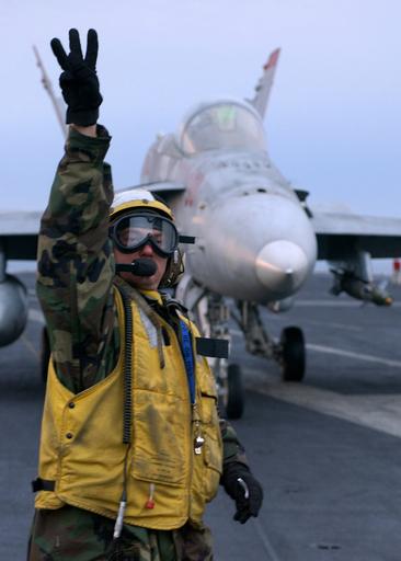 Keywords: Defense.gov News Photo 041224-N-5345W-129.jpg en Petty Officer 3rd Class Jason Baty relays a signal to other flight deck crew of the aircraft carrier USS Harry S Truman CVN 75 as an F/A-18C Hornet taxis towards the catapult for launch on Dec 24 2004 Truman and its embarked Carrier Air Wing 3 is providing close air support and conducting intelligence surveillance and reconnaissance missions over Iraq Baty is a Navy Aviation Boatswain's Mate Aircraft Handler The Hornet is assigned to Strike Fighter Squadron 37 041224-N-5345W-129 Navy http //www defense gov/photos/newsphoto aspx newsphotoid 5905 2004-12-24 en Airman Kristopher Wilson U S Navy PD-USGov-Military-Navy Defense gov news media for December 2004 Import by User Slick-o-bot/Defense gov News Photos Taken with Nikon D1X USS Harry S Truman CVN-75 F/A-18C Hornet on flight decks |