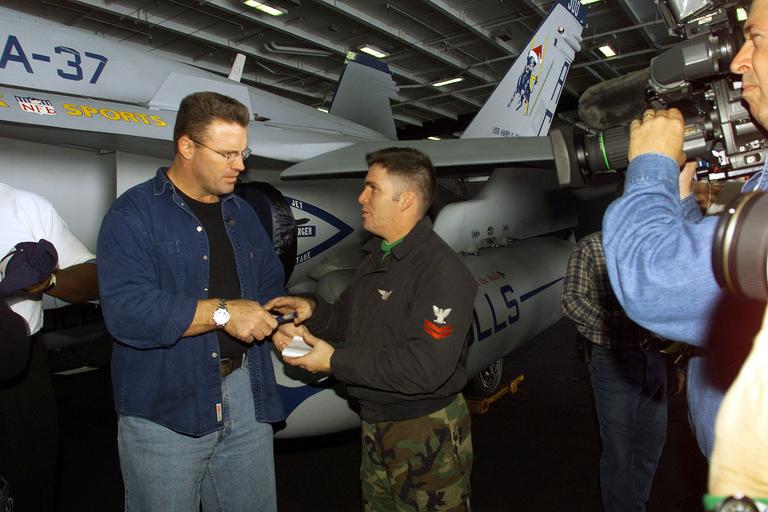 Keywords: Defense.gov News Photo 001214-N-0963E-007.jpg en Fox Sports celebrity Howie Long left signs an autograph for a crew member in the hangar deck of the USS Harry S Truman CVN 75 on Dec 14 2000 Long is aboard the aircraft carrier to tape the National Football League Pre-Game Show to be aired on the Fox network on December 16th and 17th The Truman Battle Group is operating in the Mediterranean Sea on a scheduled six-month deployment 001214-N-0963E-007 Navy http //www defense gov/photos/newsphoto aspx newsphotoid 3170 2000-12-14 en Airman Apprentice Raynel Emmons U S Navy PD-USGov-Military-Navy Defense gov news media for December 2000 Import by User Slick-o-bot/Defense gov News Photos Defense gov photos requiring renaming USS Harry S Truman CVN-75 |