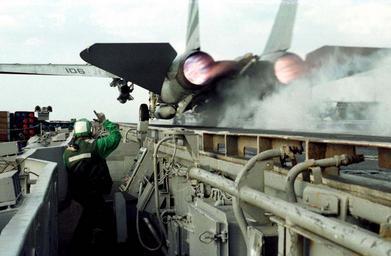 Keywords: Defense.gov News Photo 980222-N-2836H-002.jpg en Petty Officer 3rd Class Joshua Schwandt signals a clear launch after an F-14 Tomcat roars over his head from the port side catapult of the USS Independence CV 62 as the ship operates in the Persian Gulf on Feb 22 1998 Independence and its embarked Carrier Air Wing 5 are on station in the Persian Gulf in support of Operation Southern Watch which is the U S and coalition enforcement of the no-fly-zone over Southern Iraq Schwandt from Sacramento Calif is a Navy aviation boatswain's mate launch and recovery equipment operator 980222-N-2836H-002 Navy http //www defense gov/photos/newsphoto aspx newsphotoid 1188 1998-02-22 en Airman Brian J Hoosack U S Navy PD-USGov-Military-Navy Import by User Slick-o-bot/Defense gov News Photos F-14A Tomcat on flight decks Fighter Squadron 154 United States Navy Aboard USS Independence CV-62 F-14 Tomcat aircraft carrier launches Aircraft using afterburning |