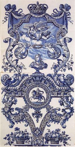 | Keywords: Delftware tiles with bust of William III of England.jpg after en Tiles with depiction in blue of an equestrian portrait of William III as Roman emperor Partie du carrelage mural de la Water Gallery à Hampton Court <ref>Marleen Domenicus-van Soest 2003 Les Chefs-d'oeuvre Guide mus cat Amsterdam Rijksmuseum Amsterdam p 68 </ref> nl Tegel met voorstelling in blauw van een medaillon waarin Willem III als Romeins keizer te paard en Two large tiles from a column <ref>http //www wga hu/html/zzdeco/5ceramic/delft/1d_13til html Two large tiles from a column by UNKNOWN POTTER Dutch Web Gallery of Art </ref> ~ 1690 cm 125 3 63 4 langSwitch Tin-glazed earthenware Tinglazuur aardewerk institution Rijksmuseum collectie keramiek accession number BK-KOG-1681 WM monogram ~ object history ca 1690 commission William III Mary II of England Hampton Court Palace ProvenanceEvent 1923 loan Rijksmuseum Amsterdam http //www wga hu/html/zzdeco/5ceramic/delft/1d_13til html www wga hu PD-old-100 references <references /> Delftware tiles Wall tiles Delftware William III of England Ceramics in the Rijksmuseum Amsterdam Kocks Adriaen Images from Web Gallery of Art Kocks Adriaen Rijksmuseum Amsterdam - Room 2 22 Daniel Marot I Greek A Factory |