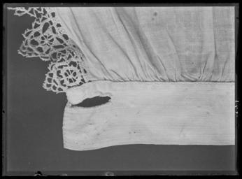 Keywords: Den innersta av Gustav II Adolfs Lützenskjortor - Livrustkammaren - 43756.tif LSH artwork sv Skjortan är sydd av 3 stora stycken l ca 1425 mm som kan iakttagas frÃ¥n krage till nederfÃ¥ll VÃ¥dbredden är 920 mm som kan konstateras frÃ¥n V nedre sprundet där staden gÃ¥r till fällsömmen i H sida Den smala ökningsvÃ¥den pÃ¥ H sida är 220 + 220 mm bred 440 mm H framstyckspartiet har spÃ¥r av skarvsömmen stadkanten är 500 mm lÃ¥ng utefter H sidsöm pÃ¥ framstycket som är en kastfÃ¥ll - sydd frÃ¥n avigsidan kastad stad mot stad 10 V-vända kaststygn / cm Intill denna söm har en rektangulär lucka rivits ut 190 x 40 mm Ärmens spjäll och andra fÃ¥llar är fällsömmar med 9 stygn / cm Spetsarna är kastade med ca 6 stygn / cm <br/>Av kragen finns en 230 mm lÃ¥ng flisa utefter kantfÃ¥llen nedtill Spetsen är delvis lossliten - sitter fast blott 50 mm och är myckt blodig L ca 130 mm Kragen är 60 mm hög och dubbelvikt <br/>Skjortan är inveckad med täta rynkor i kragen 20 rynkor / cm och sydd med 10 kaststygn och 7 efterstygni garneringssömmen / cm närmast rynkorna och 6 stygn ytterst Spetsen är 50 resp 20 mm hög <br/>Manschetten är 48 mm bred Sprundet är bevarat 70 mm lÃ¥ngt C a 14 rynkor / cm och 8 resp 6 garneringsstygn / cm Spetsen är fastkastad med ca 8 stygn Ã¥t V med vitt lingarn <br/>KastfÃ¥llen i skjortans nederkant är 15 mm bred och nedkastad med ca 9 stygn / cm H-vända med samma trÃ¥dsom skjortans - Varpen otvinnad inslaget ev svagt V-tvinnat <br/>Ett litet stycke av skjortan utgöres av en smal mycket blodig remsa frÃ¥n ena ärmen med kvarsittandespetsgarnering och en liten rest av manschetten Härav kan man fastställa ärmlängden till ca 590 mm dÃ¥sömmen mot skjortans bÃ¥lparti bevarats knappt 80 mm PÃ¥ detta stycke finns ca 140 mm kvar av aelsömmen som är en fällsöm som smalnar mot axeln <br/>Skjortans minsta smala remsa är ett stycke av V ärm som passar i den hackiga konturen pÃ¥ ärmens minstblodia parti med den mellersta myckt blodiga spetsen Detta stycke har sÃ¥väl ett stycke av skjortansaxelsöm 140 mm som lagts omlott i en sneddad söm mellan 7-14 mm bred Garneringssömmen sydd med 7stygn / cm I fortsättningen av den blott knappt 30 mm breda remsan med spetsen centralt nedtill sitteren 5 mm bred flisa av manschetten kvar med del av spets ocksÃ¥ Blott ca 480 mm av spetsens längd finns dock kvar här de översta 110 mm är bortrivna Av V ärms V axelparti finns av framstycket ett revat parti som överst har den vikta fÃ¥llen som är 145mm lÃ¥ng Efter 30 mm nerÃ¥t är en med sömmen parallell reva ca 90 mm lÃ¥ng sÃ¥ att blott en 15 mm bredtunga hÃ¥ller samman det snedrivna stycket som tillkommer med en längd av 170 mm och höjd av 130 mm Bakstycket som har en längd av 135 mm vid fÃ¥llen mot framstycket är ungefär jämnbrett med ca 110 mmbredd och nederst 240 mm lÃ¥ngt <br/>Gemensamt <br/>Av linnelärft med trÃ¥dantal 43 varptrÃ¥dar x 44 inslagstrÃ¥dar / cm2 sammanfogad av framstycke bakstycke b 1470 mm sidstycke samt ärmar ärmspjäll krage och ärmlinningar I sidorna har nertill ämnats ca 510mm höga sprund staden är synlig här i v sida Skjortans bÃ¥lparti är rakt tillskuret Nedtill harskjortan fÃ¥llats upp med en 15-20 mm bred fÃ¥ll sydd med 5 à 6 stygn/cm av H-tvinnat lingarn Derektangulärt tillskurna ärmarna blott den v nÃ¥gorlunda bevarad är 610 mm lÃ¥nga och 460 mm breda ochgarnerade med 3 rader knappt 20 mm breda vita knypplade mellanspetsar pÃ¥sydda med ca 100 mm mellanrum Ärmarna är fastsydda i skjortans sidsöm pÃ¥ v sida där staderna stöta mot varandra I h sida har manklippt upp ett 390 mm lÃ¥ngt sprund för ½ ärmbredden 230 mm + spjäll 160 mm 390 mm Nedanförärmstycket har alltsÃ¥ ett spjäll med ca 160 mm sida sytts fast Ärmarna är alltsÃ¥ isydda helt normalt och inte som Anna Maja Nylén förmodat enligt en mer egendomlig konstruktion sÃ¥ att ärmen skulle nÃ¥ ändafram till halslinningen <br/>Axelsömmarna är i det allra närmaste helt raka de yttersta 165 mm Man har blott vikt ner fÃ¥llarna nÃ¥gotbredare mot axeln än mot halsen ca 5 mm differens Härefter har ll Ã¥terstÃ¥ende vidd rynkats in i dendubbelvikta knappt 70 mm hÃ¥ga kragen som är ca 400 mm lÃ¥ng sÃ¥ att frampartierna av skjortorna fördelatspÃ¥ kragens främre decimeterlÃ¥nga stycken medan ryggstycket rynkats i kragens bakre 200 mm <br/>Halssprundet är klippt upp vertikalt i framstycket l minst 270 mm synligt i h sida därspetsgarneringen bevarats en 15 mm bred uddspets Dessutom kan pÃ¥pekas att sprundet ej placerats heltsymmetriskt mitt pÃ¥ skjortans framstycke utan med ett par centimeters förskjutning Ã¥t h dÃ¥ det klipptsca 600 mm frÃ¥n v sidsöm och 230 + 350 580 mm frÃ¥n h sida Dekor av en 15 mm bred uddspets rapport 20mm Överst pÃ¥ kragen är denna typ av spets fastsydd för att stÃ¥ upp som en avslutande kant PÃ¥ kragensutsida är kant i kant med den smala spetsen och nedÃ¥t en bredare uddspets fastsydd Denna är 50 mm bredoch har en rapport av 22 mm motivet pÃ¥minner om solfjädrar <br/>Kragens garneringssömmar sydda med efterstygn i 2 parallella rader med 7 stygn/cm och 16 rynkor avskjortan / cm Spetsen är fastkastad med 7 stygn / cm med H-tvinnat lingarn <br/>H axelsöm är en fällsöm lik den pÃ¥ skjorta C 14-3 mm bred och 165 mm lÃ¥ng Den är sydd med 3 sömmar med eftersygn Av v sidostycke ryggstycket framgÃ¥r att skjortans sidosprund sannolikt varit ca 510 mm lÃ¥ngt Isjälva sömmen är plagget emellertid uppfläkt Den V ärmen som är rel bra bevarad är nedtill vid linningen som klippts upp oerhört blodig Denhar ett ca 70 mm lÃ¥ng ärmsprund - sönderrivet och manschetten är ca 45 mm hög hur lÃ¥ng kan ej avgöras En 17 mm bred mellanspets med hjulmotiv rapport 25 mm har som garnering sytts pÃ¥ ärmarna i 3rader ända uppifrÃ¥n axelsömmen och ned till ärml