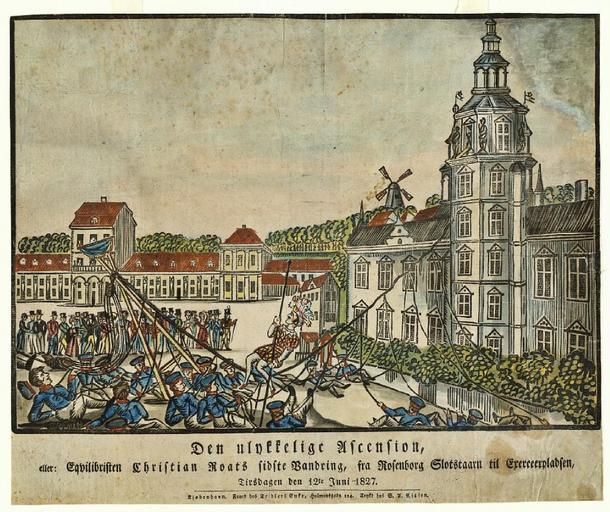 | Keywords: Den ulykkelige Ascension object207.jpg da Tekst Den ulykkelige Ascension eller Eqvilibristen Christian Roats sidste Vandring fra Rosenborg Slotstaarn til Exerceerpladsen Tirsdagen den 12te Juni 1827 Den populære hollandske linedanseren Christian Roat 1788-1827 styrter ned på Rosenborg Eksercerplads og omkommer en The tightrope walker Christian Roat 1788-1827 falls down from the tower of Rosenborg Castle and dies Det Kongelige Bibliotek http //www kb dk/images/billed/2010/okt/billeder/da/object207/ Triblers Enke Holmensgade 114 København Expired copyright PD-Art Collections of The Royal Library Denmark Kistebilleder 1827 in Denmark Accidents Tightrope walking in art |