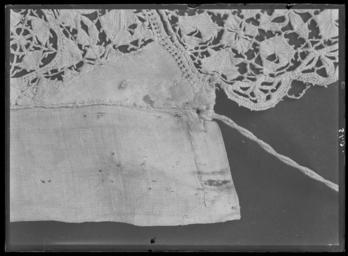 | Keywords: Den yttersta av Gustav II Adolfs Lützenskjortor - Livrustkammaren - 35197.tif LSH artwork sv Rester av skjorta i 3 delar ryggstycke med en bit av kragen v framstycke med kragstycke och större delen av ärmen samt h framstycke med kragens främre halva och en del av bakstycket <br/><br/>1 Ryggstycket med en bit av kragen <br/>Skjortans vådbredd har i h ö sida utökats med en våd av 460 mm som tillför plagget en bredd av 230 mm på resp fram- och bakstycket På ryggsidan är denna fåll gjord som stad mot stad - sammankastad fåll från avigsidan av plagget 7 kaststygn åt v med H-tvinnat lingarn Av denna fåll finns nerifrån kantfållen kvar 350 mm sedan har sannolikt från sprundet klippts och rivits en stor lucka av sömmen saknas 360 mm sedan kommer på nytt ett 630mm långt stycke av kastfållen Okstycket är här blott ett oregelbundet klippt stycke med snedklippt överkant På V sida som rivits av utefter sidfållen - fällsömmen finns blott ytterligare ett stycke av ärmspjället kvar och en liten bit 40 mm av dess söm mot ärmen Spjällets kant är här 150 mm Fållen sydd med h-tvinnat lingarn med 6 stygn /cm och drygt 1 mm bredd Av kragen återstår i underkanten en 145 mm lång bit Upptill blott en 100 mm lång bit där spetsen sytts fast med 8 stygn kast- åt V/cm med H-tvinnat lingarn Kragen är 670 mm hög I kragen har ca 16 rynkor stripats och 7 kaststygn åt H sytts ned på rätan och ca 7 stygn/cm i de tättplacerade parallella garneringssömmarna Hela arrangemanget är ej mer än 3 mm brett H-tvinnatlingarn har använts till garneringssömmarna Den breda uddspetsen med bl a flätslag är 50 mm bred den smala 15 mm Den breda har en rapport av ca 24 mm <br/><br/>2 Ett stycke av skjortans V framsida med kragstycke och större delen av ärmen <br/>Största längd fram är från kragens underkant max 530 mm och 140 mm halssprund finns kvar Här är också vådbredden bevarad mellan halssprund och ärmsöm Av ärmsömmen finns det 290 mm kvar varav 220 ovanför spjället som alltså är bevarat som en 70 mm bred remsa och här är spjället klippt snett ½ våden verkar då att vara 595 à 600 mm bred på v bröstsida Slätt parti fram på axeln är ungefär 200 mm enligt detta stycke att döma Ärmmanschetten är 45 mm bred med stripade veck ca 12 veck/cm och 7 stygn såväl mellan dessa som i de 2 garneringsraderna hela dekorens bredd 3 mm Spetsen är densamma som på kragen Manschettstyckena är mycket blodiga <br/><br/>3 H framstycke fr o m halssprundet med kragens främre halva och en del av bakstycket av kragen hela axelsömmen samt en övre del av ärmen med spjället - som dock har en reva En ände till1150 mm nående remsa finns av skjortans framstycke från axelsömmen räknat Nederst är denna blott 110 mm bred och då den tydligen har klippts av när tyget redan låg veckat är dess kant uddig souvenir Axelsömmen är 160 mm och sneddad så att den är 130 mm vid axeln men krymper till blott ett par mm vid halsen På rätsidan är det ryggstycket som går över framstycket 3 sömmar med 7-8 stygn/cm Det övriga tyget - de ca 420 mm har rynkats samman i kragen till 100 mm Fällsömmen som förenar framstyckets med sidovåden är gjord för att bli särskilt smidig från skjortans insida med 7 kaststygn åt V gjort från rätan över staden Fållen är blott millimeterbred Av kragen finns i nederkanten en 160 mm lång bit I överkanten är den dock inte mycket mer än 130mm från hörnet räknat Längs överkanten står den smala uddspetsen upp och den löper utefter halssprundet mitt fram På kragens horisontella del är från överkanten och nedfallande en bredare uddspets fästad <br/><br/>Gemensamt <br/><br/>Av linnelärft med trådantal 43 varptrådar x 44 inslagstrådar / cm2 sammanfogad av framstycke bakstycke b 1470 mm sidstycke samt ärmar ärmspjäll krage och ärmlinningar I sidorna har nertill ämnats ca 510 mm höga sprund staden är synlig här i v sida Skjortans bålparti är rakt tillskuret Nedtill har skjortan fållats upp med en 15-20 mm bred fåll sydd med 5 à 6 stygn/cm av H-tvinnat lingarn De rektangulärt tillskurna ärmarna blott den v någorlunda bevarad är 610 mm långa och 460 mm breda och garnerade med 3 rader knappt 20 mm breda vita knypplade mellanspetsar påsydda med ca 100 mm mellanrum Ärmarna är fastsydda i skjortans sidsöm på v sida där staderna stöta mot varandra I h sida har man klippt upp ett 390 mm långt sprund för ½ ärmbredden 230 mm + spjäll 160 mm 390 mm Nedanför ärmstycket har alltså ett spjäll med ca160 mm sida sytts fast Ärmarna är alltså isydda helt normalt och inte som Anna Maja Nylén förmodat enligt en mer egendomlig konstruktion så att ärmen skulle nå ända fram till halslinningen <br/><br/>Axelsömmarna är i det allra närmaste helt raka de yttersta 165 mm Man har blott vikt ner fållarna något bredare mot axeln än mot halsen ca 5 mm differens Härefter har ll återstående vidd rynkats in i den dubbelvikta knappt 70 mm håga kragen som är ca 400 mm lång så att frampartierna av skjortorna fördelats på kragens främre decimeterlånga stycken medan ryggstycket rynkats i kragens bakre 200 mm <br/><br/>Halssprundet är klippt upp vertikalt i framstycket l minst 270 mm synligt i h sida där spetsgarneringen bevarats en 15 mm bred uddspets Dessutom kan påpekas att sprundet ej placerats helt symmetriskt mitt på skjortans framstycke utan med ett par centimeters förskjutning åt h då det klippts ca 600 mm från v sidsöm och 230 + 350 580 mm från h sida Dekor av en 15 mm bred uddspets rapport 20 mm Överst på kragen är denna typ av spets fastsydd för att stå upp som en avslutande kant På kragens utsida är kant i kant med den smala spetsen och nedåt en bredare uddspets fastsydd Denna är 50 mm bred och har en rapport av 22 mm motivet påminner om solfjädrar <br/><br/>Kragens garneringssömmar sydda med efterstygn i 2 parallella rader med 7 stygn/cm och 16 rynkor a
