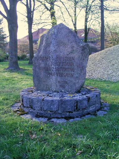 Keywords: Denkstein Oyten.jpg en Memorial stone de Denkstein in Oyten Die Bürgerinitiative gegen den Ausbau der B75 ließ 1982 den Denkstein anfertigen und in der geplanten Ausbautrasse der Bundesstraße 75 heute L168 in der Ortslage Oyten aufstellen Bei Beginn der Straßenbauarbeiten für die anbaufreie Strecke zwischen Lindenstraße / Dorfstraße und der Landesstraße L167 K2 / Achimer Straße wurde der Stein vor das Rathausgelände umgesetzt Niederdeutsche Inschrift Solange dieser Stein bleibt stehen wird unsere Hoffnung nicht vergehen Oyten 1982 nds SOLANGE Dà SSE STEEN BLIFFT STAHN SCHALL USE HOFFNUNG NICH VERGAHN OYTEN 1982 own OytenHeute 2010-04-18 Oyten Taken with Ricoh Caplio G4 wide |
