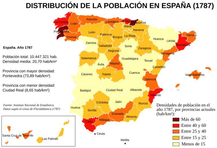 | Keywords: Densidades de población en España (1787).svg Mapa de España con las densidades de población por provincias actuales según el censo de Floridablanca realizado en 1787 Censo de 1787 Floridablanca INE Artes Gráficas Sorual Madrid 1991 Tomo 6 Los datos pueden consultarse en Evolución Población Provincias España 1787 - 1900 pdf 2007-07 Creando por Rodriguillo tomando como mapa base Image Provinces of Spain svg creado por Emilio Gómez Fernández GFDL Image Densidades de población en España 1787 png Rodriguillo Population density maps of Spain Maps of the history of Spain 1787 in Spain |