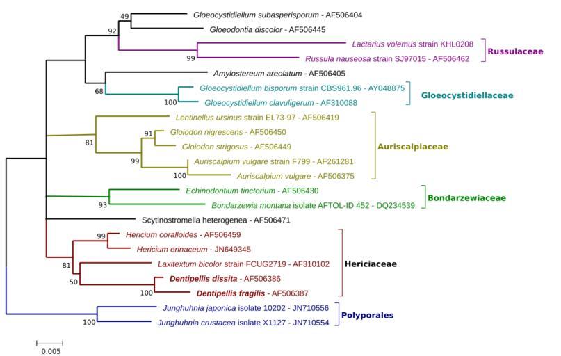 Keywords: Dentipellis.svg Evolutionary relationships of Dentipellis<br/> The evolutionary history was inferred using the Minimum Evolution method The optimal tree with the sum of branch length 0 35832204 is shown The percentage of replicate trees in which the associated taxa clustered together in the bootstrap test 1000 replicates are shown next to the branches The tree is drawn to scale with branch lengths in the same units as those of the evolutionary distances used to infer the phylogenetic tree The evolutionary distances were computed using the Maximum Composite Likelihood method and are in the units of the number of base substitutions per site The ME tree was searched using the Close-Neighbor-Interchange CNI algorithm at a search level of 2 The Neighbor-joining algorithm was used to generate the initial tree The analysis involved 22 nucleotide sequences All positions with less than 95 site coverage were eliminated That is fewer than 5 alignment gaps missing data and ambiguous bases were allowed at any position There were a total of 1083 positions in the final dataset Evolutionary analyses were conducted in MEGA5 All sequences were obtained from the Genbank and were aligned by the Muscle algorithm with standard settings <br/> List of the GenBank Sequences http //www ncbi nlm nih gov/nuccore/AF506405 Amylostereum areolatum - AF506405 http //www ncbi nlm nih gov/nuccore/AF506386 Dentipellis dissita - AF506386 http //www ncbi nlm nih gov/nuccore/AF506387 Dentipellis fragilis - AF506387 http //www ncbi nlm nih gov/nuccore/AF506430 Echinodontium tinctorium - AF506430 http //www ncbi nlm nih gov/nuccore/AY048875 Gloeocystidiellum bisporum strain CBS961 96 - AY048875 http //www ncbi nlm nih gov/nuccore/AF310088 Gloeocystidiellum clavuligerum - AF310088 http //www ncbi nlm nih gov/nuccore/AF506404 Gloeocystidiellum subasperisporum - AF506404 http //www ncbi nlm nih gov/nuccore/AF506445 Gloeodontia discolor - AF506445 http //www ncbi nlm nih gov/nuccore/AF506450 Gloiodon nigrescens - AF506450 http //www ncbi nlm nih gov/nuccore/AF506449 Gloiodon strigosus - AF506449 http //www ncbi nlm nih gov/nuccore/AF506459 Hericium coralloides -AF506459 http //www ncbi nlm nih gov/nuccore/JN649345 Hericium erinaceum - JN649345 http //www ncbi nlm nih gov/nuccore/KHL0208 Lactarius volemus strain KHL0208 http //www ncbi nlm nih gov/nuccore/AF506419 Lentinellus ursinus strain EL73-97 - AF506419 http //www ncbi nlm nih gov/nuccore/AF506462 Russula nauseosa strain SJ97015 - AF506462 http //www ncbi nlm nih gov/nuccore/AF506471 Scytinostromella heterogenea - AF506471 http //www ncbi nlm nih gov/nuccore/DQ234539 Bondarzewia montana isolate AFTOL-ID 452 - DQ234539 http //www ncbi nlm nih gov/nuccore/AF261281 Auriscalpium vulgare strain F799 - AF261281 http //www ncbi nlm nih gov/nuccore/AF506375 Auriscalpium vulgare - AF506375 http //www ncbi nlm nih gov/nuccore/AF310102 Laxitextum bicolor strain FCUG2719 - AF310102 http //www ncbi nlm nih gov/nuccore/JN710556 Junghuhnia japonica isolate 10202 - JN710556 http //www ncbi nlm nih gov/nuccore/JN710554 Junghuhnia crustacea isolate X1127 - JN710554 own 2014-04-28 User Thkgk Cc-zero Dentipellis |