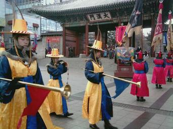 | Keywords: Deoksugung Changing of the Guard Reenactment - palace bands 1.jpg en Reenactment of changing of the palace guards during Joseon dynasty Palace bands are tracking guards They play drum bugle trumpet shell and so on own Self-made 2013-12-19 Deoksugung |