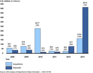 Keywords: Department of State Overseas Real Property Acquisitions and Disposals.jpg en Figure 1 Department of State Overseas Real Property Acquisitions and Disposals Fiscal Years 2008 through 2013 This image is excerpted from a U S GAO report http //www gao gov/products/GAO-14-769 www gao gov/products/GAO-14-769 OVERSEAS REAL PROPERTY https //en wikipedia org/wiki/United_States_Department_of_State State Department Needs to Improve Guidance and Records Management Notes The numbers of properties are in parentheses Dollars are not adjusted for inflation The relatively large increases in acquisitions in fiscal years 2010 and 2013 are due to the acquisition of land for a new London embassy 183 million in 2010 and an office building in Paris 55 million in 2013 The increase in fiscal year 2013 disposals is due to the sale of the current London embassy 437 million The new London embassy is currently under construction with completion expected in 2017 Photo by https //en wikipedia org/wiki/Government_Accountability_Office U S Government Accountability Office 2014-09-29 https //www flickr com/photos/usgao/15391212382/ U S Government Accountability Office other versions PD-USGov Government Accountability Office |