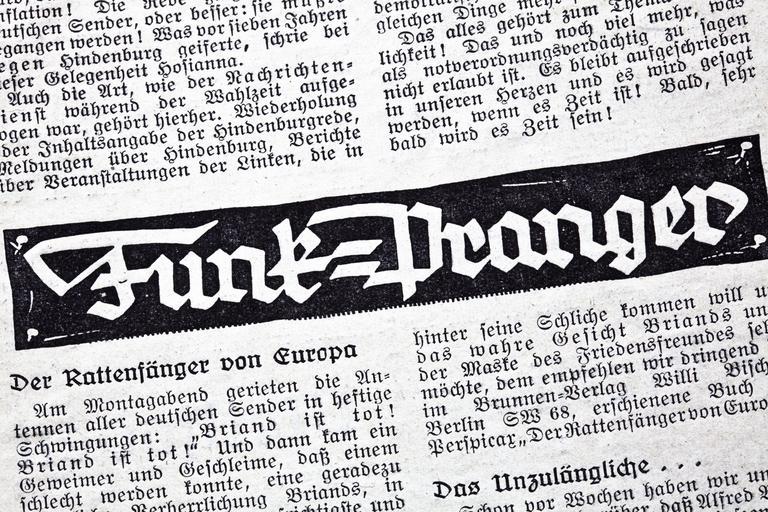 Keywords: Der Deutsche Sender Funkpranger 1932.jpg en Photograph of a section of page 4 of Der Deutsche Sender a German radio publication run by the Nazi Party and other right wing groups This section is called Funk-Pranger a harsh expression for radio reviews de Foto eines Ausschnitts aus Seite 4 der Ausgabe 12 3 Jahrgang von Der Deutsche Sender einer u a von der NSDAP getragenen Radiozeitschrift Hier die Rubrik der Funkkritik genannt Funk-Pranger Seite 4 der Ausgabe 12 1932 von Der Deutsche Sender Reichsverband Deutscher Rundfunkteilnehmer E V nationalsozialistisch 1932-03-20 Foto eines antiquarischen Titels aus reiner Typografie Typografisch ohne Schaffenshöhe Cc-zero 1932 magazines National Socialist German Workers' Party Radio of Germany Magazines of Germany |