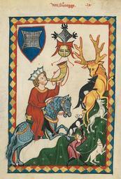 | Keywords: Der von Suonegge.jpg Codex Manesse UB Heidelberg Cod Pal germ 848 fol 202v Der von Suonegg; vermutlich Konrad von Suonegge bezeugt 1220-1241 aus der Familie der Freien von Suonegge beheimatet in der Untersteiermark http //digi ub uni-heidelberg de/diglit/cpg848/0400 between 1305 1315 Creator Meister des Codex Manesse Grundstockmaler PD-old-100 assessments 1 Codex Manesse 202v Meister des Codex Manesse Grundstockmaler 202v Minnesingers Konrad of Sanneck Squirrel clothing in art Male fur headgear in art Medieval miniatures of hunting Medieval miniatures of deers Medieval miniatures of horses Horns in art |