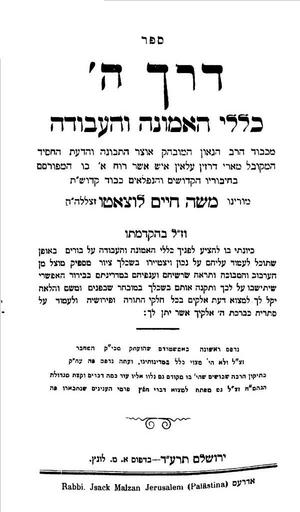 Keywords: Derech Hashem.jpg he שער ספר דרך ה' 1914 - תרעד http //www hebrewbooks org/38531 רבי משה חיי וצאטו רמח other versions PD-old-70-1923 Title pages in Hebrew