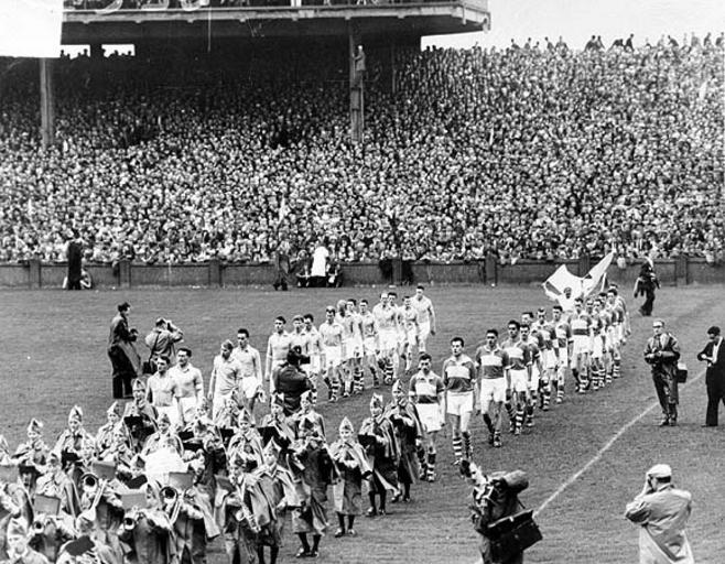 | Keywords: derry senior footballers derryseniorfootballers dublin senior footballers dublinseniorfootballers all-ireland football final allirelandfootballfinal artane boys' band artaneboysband g.a.a. gaa gaelic athletic association gaelicathleticassociation cumann lúthchleas gael cumannlúthchleasgael croke park crokepark football september 1958 1950s independent newspapers collection independentnewspaperscollection national library of ireland nationallibraryofireland blackandwhite monochrome outdoor black and white Derry and Dublin Senior Footballers march out behind the Artane Boys' Band at Croke Park for the All-Ireland Final on 28 September 1958. According to the Irish Times of Monday, 29 September 1958, the official attendance at Croke Park was 73,731. It was "estimated that a further 25,000 people failed to gain admission." Dublin won. The final score was Dublin 2:12 to Derry's 1:9 Date: 28 September 1958 NLI Ref.: INDR1701A Derry and Dublin Senior Footballers march out behind the Artane Boys' Band at Croke Park for the All-Ireland Final on 28 September 1958. According to the Irish Times of Monday, 29 September 1958, the official attendance at Croke Park was 73,731. It was "estimated that a further 25,000 people failed to gain admission." Dublin won. The final score was Dublin 2:12 to Derry's 1:9 Date: 28 September 1958 NLI Ref.: INDR1701A |