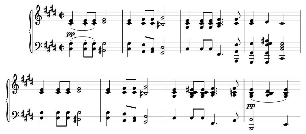 | Keywords: DerWandererD493-theme.svg Franz Schubert's theme from Der Wanderer D 493 LilyPond source <pre> \header title Der Wanderer D 493 subtitle Theme source IMSLP00891 Leipzig Edition Peters n d ca 1905 Plate 9023 composer Franz Schubert 1797-1828 copyright Public Domain \version 2 10 \score \new PianoStaff << \new Staff \clef treble \key e \major \time 2/2 <cis' e'>4\pp- <cis' e'>8- <cis' e'>8- <dis' fis'>2 <cis' e'>4 <cis' fis'>8 <cis' fis'>8 <bis gis'>2 <gis cis' e'>4 <gis cis' e'>8 <gis cis' e'>8 <a cis' fis'>4 <cis' fis'>8 <cis' e'>4 dis'4 cis'2 \break <cis' e'>4 <cis' e'>8 <cis' e'>8 <dis' fis'>2 <cis' e'>4 <cis' fis'>8 <cis' fis'>8 <gis' bis>2 <gis cis' e'>4 <gis b cis' eis'>8 <gis b cis' eis'>8 <a cis' fis'>4 <a c' fis'>8 <gis b e'>4\pp <a b dis'>4 <gis b e'>4 \new Staff \clef bass \key e \major \time 2/2 <cis gis>4- <cis gis>8- <cis gis>8- <bis gis>2 <cis gis>4 <a fis>8 <a cis>8 <gis dis>2 cis4 cis8 cis8 fis 4 <a a fis>8 <gis gis gis>4 <gis gis fis gis bis>4 <cis cis e gis>2 \break <cis gis>4 <cis gis>8 <cis gis>8 <bis gis>2 <cis gis>4 <a fis>8 <a cis>8 <gis dis>2 cis4 cis8 cis8 fis 4 a 8 <b b >2 e 4 >> \midi </pre> SVG file generated from Lilypond output Rework with Inkscape removed text and converted all objects to paths then saved as simple SVG en Piano accompaniment from Franz Schubert's lied Der Wanderer D 493 second couplet Die Sonne dünkt Ich bin ein Fremdling überall fr Accompagnement au piano du deuxième couplet du lied Der Wanderer D 493 de Franz Schubert Die Sonne dünkt Ich bin ein Fremdling überall Own Romainbehar 2008-07-06 Image DerWandererD493-theme mid GNU LilyPond images Der Wanderer |