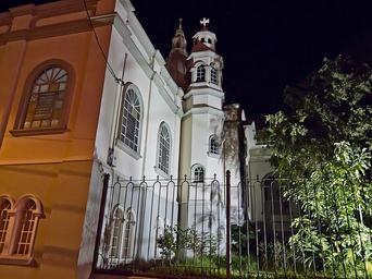 Keywords: desamparados costa rica cathedral church night evening religion faith facade details light lighting tree fence spire architecture outside