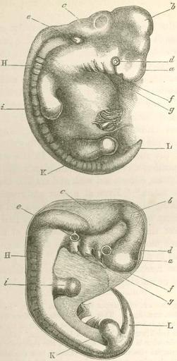 | Keywords: Descent fig02.jpg Woodcut depicting the similar appearance of a human embryo top and a dog embryo bottom from Charles Darwin's Descent of Man 1871 Original caption Fig 1 Upper figure human embryo from Ecker Lower figure that of a dog from Bischoff http //darwin-online org uk/content/frameset itemID F937 1 viewtype text pageseq 381 1871 See above Public domain PD-old-70 The Descent of Man and Selection in Relation to Sex 1871 Embryos | ||||