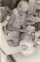 Keywords: churches cooking 1970s monochrome indoor On back of photograph: "Presbytereon [sic] ladies making Easter eggs. Mrs Blake Moore, Mrs Dorothy McCullough". Mrs McCullough is measuring butter into a pan, while Mrs Moor appears to be sifting Redpath icing sugar into a bowl. This activity was taking place at the Presbyterian Church of the Redeemer in St. George Street, Deseronto, Ontario. On back of photograph: "Presbytereon [sic] ladies making Easter eggs. Mrs Blake Moore, Mrs Dorothy McCullough". Mrs McCullough is measuring butter into a pan, while Mrs Moor appears to be sifting Redpath icing sugar into a bowl. This activity was taking place at the Presbyterian Church of the Redeemer in St. George Street, Deseronto, Ontario. |