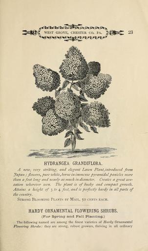 Keywords: Descriptive catalogue of new and beautiful roses (16249386780).jpg 23 <br> CRQSSCUPEkV 'EST PI-IILA r -- <br> HYDRANGEA GRANDIFLORA <br> A new very striking and elegant Lawn Plant introduced from <br> Japan ; flowers pnre zvhite borne in immense pyramidal panicles more <br> than afoot long and nearly as much in diameter Creates a great sen- <br> sation wherever seen The plant is of bushy arid compact growth <br> Attains a height of i to \ feet and is perfectly hardy in all parts of <br> the country <br> Strong Blooming Plants by Mail 50 cents each <br> HARDY ORNAMENTAL FLOWERING SHRUBS <br> For Spring and Fall Planting <br> The following named are among the finest varieties of Hardy Ornamental <br> Flowering Shrubs they are strong robust growers thriving in all ordinary' 43902561 150007 78561 Page 23 Text http //www biodiversitylibrary org/page/43902561 1875 10 5962/bhl title 78561 Dingee Conard Co ; Henry G Gilbert Nursery and Seed Trade Catalog Collection NameFound Hydrangea grandiflora Biodiversity Heritage Library Descriptive catalogue of new and beautiful rosesnew album Garden Stories Catalogs Flowers Roses Seeds Trade catalogs U S Department of Agriculture National Agricultural Library bhl page 43902561 dc identifier http //biodiversitylibrary org/page/43902561 bhlGardenStories hydrangea Dingee Conard Co taxonomy binomial Hydrangea grandiflora BHLinbloom u s department of agriculture national agricultural library bhlgardenstories dingee conard co taxonomy binomial hydrangea grandiflora bhlinbloom Information field Flickr posted date ISOdate 2015-02-03 CC-BY-2 0 BioDivLibrary https //flickr com/photos/61021753 N02/16249386780 2015-08-24 05 55 32 cc-by-2 0 PD-old-70-1923 Descriptive catalogue of new and beautiful roses Photos uploaded from Flickr by Fæ using a script |