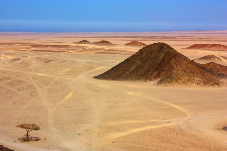 Keywords: desert sand tree mountain hill africa egypt sand dunes drought landscape vehicle tracks traces rock dry arid karg