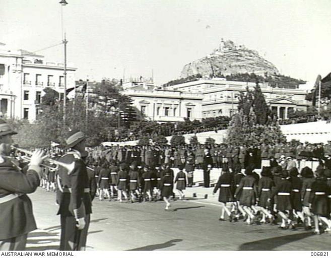 Keywords: DesfileDeEONCelebrandoIndependencia25031941--006821.jpeg en SHOT TAKEN DURING A PARADE OF THE GREEK YOUTH MOVEMENT ON THE OCCASION OF THE CELEBRATION OF INDEPENDENCE DAY KING GEORGE OF GREECE IS SEEN REVIEWING THE YOUTHFUL MARCHERS WHILE BEHIND HIM STAND THE LEADING OFFICERS OF THE GREEK ARMY es Desfile de la Organización de la Juventud Griega EON en Atenas conmemorando la independencia del país ante el rey Jorge II en abril de 1941 This image was sourced from the Australian War Memorial Collection 006821 Database http //cas awm gov au/item/006821 1941-03-25 D Parer PD-Australia PD-1996 ImageNote 1 262 194 34 69 370 339 2 King George II of Greece ImageNoteEnd 1 ImageNote 2 243 29 125 105 370 339 2 Lycabettus Hill ImageNoteEnd 2 1941 in Athens Greece in World War II George II of Greece Independence Day Greece Black and white photographs National Youth Organisation Events at the Syntagma Square March 1941 in Greece 25