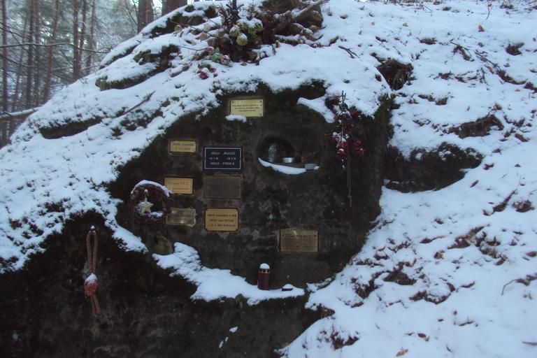 Keywords: Deska horolezců.JPG cs Na skále poblíž červené trasy od osady Vrabcov na vrchol Nedvězí je několik destiček na památku horolezců kteří měli v oblibě okolní skály symbolický hřbitov own Zákupák 2014-01-25 Nedvězí Dubá Sculptures in Dubá
