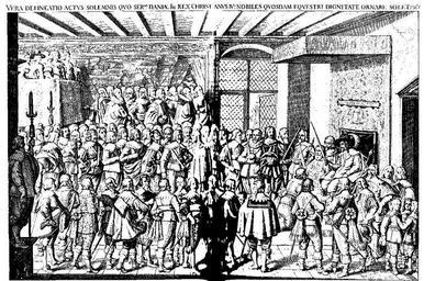 Keywords: Det store bilager 1.jpg Christian IV i riddersalen på Københavns slott På dagen for den udvalgte prins Christians bryllyp den 5 oktober 1634 ble 12 adelsmenn slått til riddere i den gamle riddersalen på Københavns slott Stikket er en samtidig skildring og er den eneste gjengivelse av interiøret på Københavns slott som man kjenner til Christian IV of Denmark in The great hall at Copenhagen Castle on the 5 th of October 1634 author 1634 Scanned from the book Memoirer og breve udgivne af Julius Clausen og P Fr Rist Det store bilager i Kjøbenhavn 1634 med Charles Ogier Det store bilager i Kjøbenhavn 1634 Gyldendalske boghandel Nordisk forlag 1914 Other versions Copenhagen Castle Christian IV of Denmark Christian Prince Elect of Denmark
