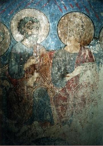 Keywords: სულთმოფენა (detail).jpg The mural in Betania Monastery Georgia The mural is called სულთმ ფე ა detail The official disk of Betania monastery XII-XIII centuries Created by order of Queen Tamar of Georgia PD-Art Betania southern wall murals