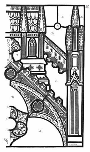 | Keywords: Detail.vitrail.eglise.Saint.Urbain.Troyes.2.png Les charmants panneaux des fenêtres de la galerie du chœur de l'église de Saint-Urbain de Troyes dont nous avons donné un échantillon fig 30 sont compris entre des compartiments de grisailles avec filets colorés Les fenêtres hautes du chœur de cette même église présentent une série de grandes figures de prophètes surmontées de dais se détachant sur un fond bleu et comprises entre des panneaux de grisailles avec filets colorés voyez fig 34 Les vêtements de ces grandes figures sont généralement clairs et vifs Les bordures sont larges et solides de ton Celle de la verrière que nous donnons ici se compose des armes de France; c'est-à-dire d'un fond bleu chargé de fleurs de lis d'or jaunes sans nombre et d'un écu de gueules à la croix d'argent blanche et de quatre clefs de même dans les quatre cantons les pannetons opposés Dictionnaire raisonné de l'architecture française du XI<sup>e</sup> au XI<sup>e</sup> siècle ~ 1856 Eugène Viollet le Duc Viollet-le-Duc Stained glass Viollet-le-Duc Vitraux de la basilique Saint-Urbain de Troyes |