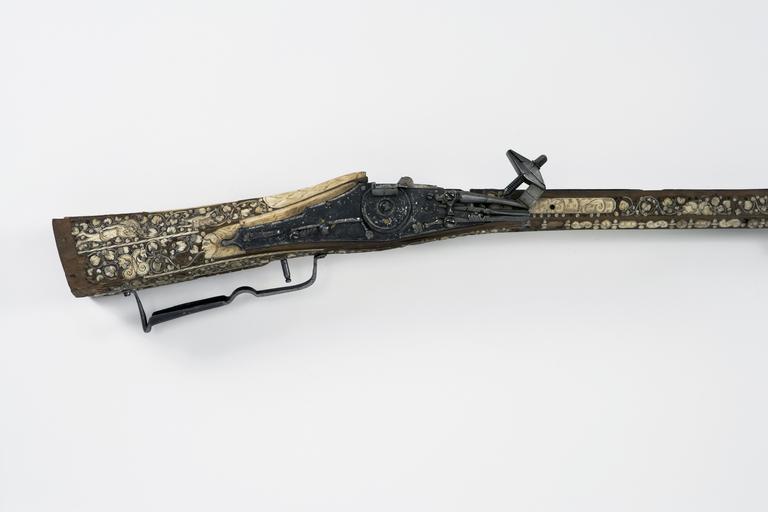 Keywords: Detalj hjullåsbösstock - Livrustkammaren - 56781.jpg Hjullås av tysk typ Hela låsblecket och hjulkapseln blånerade med dekor av påslagen guld och silver i rank- och blommönster Dekoren kraftigt sliten Plan hjulkapsel med ring Fängpanna med låg krutskärm filad dekor välvt fingergrepp med triangulär avslutning Liten tryckknapp med skruvhuvud Plan hane med lös underkäke Käkskruv med fyrsidigt huvud Kantig hanhals hankropp med runt tvärsnitt nederdelen fasad Timglasformig hanstudel Balusterformigt hanfjäderlöv med bladformig avslutning <br/>Säkring På låsbleckets bakre del en virvelsäkring <br/>Fästning Två låsskruvar <br/>Rak svarvad avtryckare <br/><br/>Ljusbrun helstock kolv av tysk typ På hela stocken mycket skadade inläggningar av graverat ben På anslagssidan ett kantband och rankornament punktdekor fågel med utbredda vingar och en landsknekt med slagsvärd på axeln På låssidan av kolven en naken kvinnofigur ovanför henne en apa som slår på trumma Vid låsbleckets bakre del ett manshuvud i profil På kolvryggen och runt svansskruvbladet breda plattor med flätband och sicksackdekor Runda låsskruvbrickor med graverade blommor Låssidans pipstiftbrickor ovala ca 150 mm långa med volutdekor Näsband av ben Rak varbygel med 1 fingerläge skålning baktill liten inbuktning därframför Påslagen guld- och silverdekor I laddstocksrännan sitter en spång av stål l ca 501 mm som utgår från avtryckaren framtill vinkelböjd och svarvad avtryckare för v hand bakänden rektangulär med hål för avtryckaren <br/><br/>Tillbehör <br/>Laddstock av trä l 670 mm med stålskoning l 181 mm profilerad och avslutad med en platt knapp original caption detalj hjullåsbösstock - LRK 3205<br/> Nyckelord Hjullåsbössa Föremålsbild early other date century 17 steel e27 - eldvapen - lås och stockbeslag material stål - gold e6 - eldvapen - låsdekor material guld - silver e6 - eldvapen - låsdekor material silver - wood e3 - eldvapen - stock material trä - bone e78 - eldvapen - stockbeslag och stockdekor material ben g 2250 size mm 1130 125 LRK Axel Oxenstierna af Södermöre Basutställning place of origin original filename lm_dig2125 39782 inventory number LRK 3205 56781 CC-BY-SA Göran Schmidt <gallery caption Different images of same object > File Detalj hjullåsbösstock v sida - Livrustkammaren - 65342 jpg File Bösstock m hjullås - Livrustkammaren - 51370 tif </gallery> Göran Schmidt Wheellock musket images from Livrustkammaren Musket images from Livrustkammaren color images Color images from Livrustkammaren Media contributed by LSH 2013-10 |
