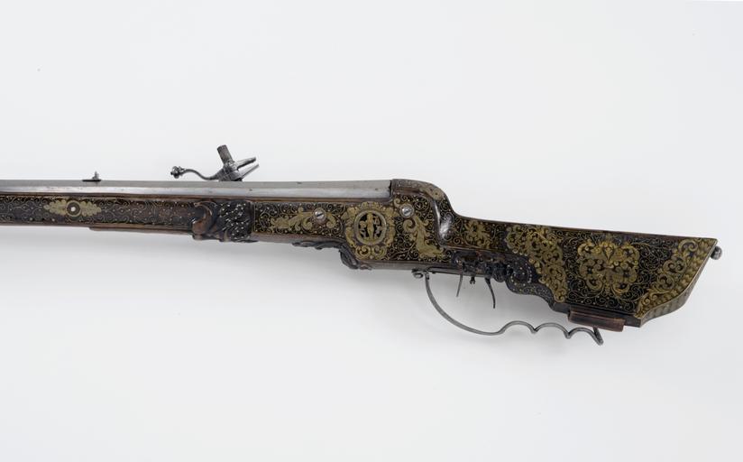 Keywords: Detalj hjullåsstudsare, v sida - Livrustkammaren - 13977.jpg Vänskapen Amicitia personifikation plain text Åttsidig räfflad pipa 6 räfflor och skålade bommar rektangulärt svansskruvblad <br/>Riktmedel Inlaxade riktmedel ståndsikte av stål med v-formig skärm stolpkorn av mässing <br/>Fästning Tre häften Pipan fäst med krysskruv underifrån främre varbygelskruven samt ett och ett halvt urspr tre pipstift av ben <br/><br/>Hjullås med plant låsbleck av tysk typ utvändigt hjul täckt av en plan genombruten hjulkapsel med två sjöjungfrur På låsblecket bakom hjulkapseln en pålagd figur av mässing i form av en man med slunga Fängpanna med bakåtböjd krutskärm fängpannelock med rörlig arm fingergrepp med kulformig avslutning Tryckknapp med litet skivformigt huvud Hane med fyrsidig kropp med genombruten skärm akantusrankor och lejon Lös överkäke och käkskruv med fyrsidigt huvud fingergreppet s-formigt svängt avslutat med en profilerad knapp Hanfjäder med lång spolformigt löv Hanstudel i form av en genombruten platta Hela låset bär spår av kraftigt nött gravyr Fängpannelockets drivfjäder blånerad <br/>Fästning Två låsskruvar <br/>Avtryckare med snälltryck <br/><br/>Helstock av valnöt med kolv av tysk typ På hela stocken punkt- och tråddekor av mässing Bakplåt av mässing med graverat plåtband och försänkt medaljong med genombruten dekor i form av en grip stödkula av stål På kolvvingen en snidad volut som övergår i lejonfigur på vingens undersida ett trärör På anslaget tre genombrutna bleck med växtornamentik Mellan låsskruvarna en oval av mässing med genombruten dekor förställande en kvinnofigur Amicitia Vänskapen ovanför ovalen en öppen krona på sidorna en ängel och ett lejon Kolvlådelock med framtill en oval plåt av mässing med graverad dekor i form av blomma och akantusblad Därbakom snidade flikar med punktdekor en kvinnofigur omgiven av trådornament en snidad knästående naken mansfigur med korg på axeln Locket avslutas baktill med ett vågkantat mässingsband med bladdekor Låsskruvbrickor bladformiga omgivna av bladslingor med odjurshuvuden De två bakre pipstiftbrickorna i form av en rund mässingsring med blad Under kammaren en snidad maskaron liksom på framstockens bakre del Liten överrrörka och ett genombrutet näsband Varbygel med tre fingerlägen på bygeln mittås och punsad dekor <br/><br/>Tillbehör <br/>Laddstock av trä l 840 mm med skoning av horn l 25 mm original caption detalj hjullåsstudsare - LRK 3202 v sida<br/> Nyckelord Hjullåsstudsare Föremålsbild early other date century 17 brass e78 - eldvapen - stockbeslag och stockdekor material mässing - steel e1247 - eldvapen - pipa lås riktmedel och beslag material stål - brass e6 - eldvapen - låsdekor material mässing - walnut e3 - eldvapen - stock material valnöt size mm 1065 size mm 782 pipa size mm 166 g 3590 LRK place of origin original filename lm_dig2120 39779 inventory number LRK 3202 13977 CC-BY-SA Göran Schmidt <gallery caption Different images of same object > File Detalj kolvlådelock hjullåsstudsare - Livrustkammaren - 22540 jpg File Detalj stockdekor hjullåsstudsare v sida - Livrustkammaren - 31102 jpg File Detalj hjullåsstudsare - Livrustkammaren - 5416 jpg File Detalj kolvllådelock hjullåsstudsare - Livrustkammaren - 48220 jpg File Detalj kolvkappa hjullåsstudsare - Livrustkammaren - 39662 jpg File Hjullåsstudsare - Livrustkammaren - 42888 tif </gallery> Göran Schmidt Musket images from Livrustkammaren color images Wheellock musket images from Livrustkammaren Media contributed by LSH dim-with multiple size templates Media contributed by LSH unmatched keyword Color images from Livrustkammaren Media contributed by LSH 2013-10