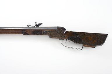| Keywords: Detalj hjullåsstudsare, v sida - Livrustkammaren - 65341.jpg Åttsidig åttaräfflad pipa av stål med plana bommar Kort rektangulärt svansskruvblad <br/>Riktmedel Inlaxade riktmedel Blånerat klaffsikte med den horisontella delen framtill vågformgad Stolpkorn av mässing <br/>Fästning Tre häften Pipan fäst med blånerad krysskruv underifrån varbygelskruven samt tre pipstift av stål <br/><br/>Hjullås av tysk typ plant låsbleck l 210 mm invändigt hjul Fängpanna med rundad framkant filad dekor bakåtböjd eldskärm fängpannelock med rörlig arm tryckknapp med runt huvud Hane med rundad hankropp med ås nederkanten liksom handstudeln balusterformad Ringformig graverad hanhals Lös överkäke med graverade linjer käkskruv med fyrsidigt huvud s-formigt fingergrepp med kulformig avslutning Hanfjäder med fasade kanter bakre delen bladformig profilerat fjäderlöv Stång avtryckarstång och hanstudel blånerade Fängpannelockets axel och hela slagfjädern brunerad <br/>Fästning Två blånerade låsskruvar <br/>Avtryckare med snälltryck allt blånerat Rektangulärt avtryckarbleck <br/><br/>Helstock av trä valnöt kolv av tysk typ med kolvlåda och vinge med kraftigt snidad volut framtill Kolvlådelock med ståltrådsdekor och snidade öglor med stålstift kartusch i ståltrådsorneringen Bakplåt och stödkula av stål På anslagssidan på kolvryggen runt låsskruvarna och svansskruvbladet ståltrådsinläggningar i form av rankor och inslagna stålstift på anslagets mitt en bladkrans Två sexpassformiga låsskruvbrickor av stål På framstockens bakre del snidade växtornament och bladvoluter med stålstift En punsad rand följer intill den snidade dekoren Överrörka av stål Näsband av horn Varbygel av stål med tre fingerlägen främre delens kanter fasade På kolvens undersida ett sigill med Stenbocksvapen under grevlig krona nedanför skölden bokstäverna I G S B G T B Johan Gabriel Stenbock Greve Till Bogesund <br/><br/>Tillbehör <br/>Laddstock av trä l 780 mm i ena änden en hornskoning l 25 mm i andra änden ett invändigt gängat stålrör l 145 mm original caption detalj hjullåsstudsare - LRK 3199 v sida<br/> Nyckelord Hjullåsstudsare Föremålsbild ca other date - 1650 1700 walnut e3 - eldvapen - stock material valnöt - steel e1247 - eldvapen - pipa lås riktmedel och beslag material stål - brass e4 - eldvapen - riktmedel material mässing g 4130 size mm 115 size mm 790 pipa size mm 1120 LRK Johan Gabriel Stenbock greve riksråd Basutställning Livrustkammarens basutställning 1978 I G S B G T B anv e3 - eldvapen - stock; Johan Gabriel Stenbock I G S B G T B anv e3 - eldvapen - stock; Johan Gabriel Stenbock place of origin original filename lm_dig2116 39776 inventory number LRK 3199 65341 CC-BY-SA Göran Schmidt <gallery caption Different images of same object > File Detalj hjullåsstudsare - Livrustkammaren - 56780 jpg </gallery> Göran Schmidt Musket images from Livrustkammaren color images Wheellock musket images from Livrustkammaren Media contributed by LSH unmatched material Media contributed by LSH dim-with multiple size templates Media contributed by LSH unmatched keyword Color images from Livrustkammaren Media contributed by LSH 2013-10 |