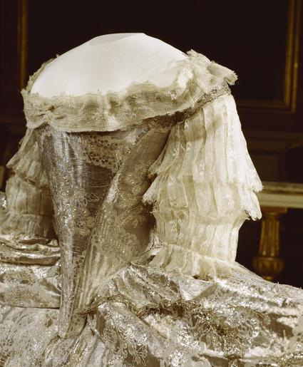| Keywords: Detalj Sofia Magdalenas bilägersdräkt - Livrustkammaren - 81600.tif LSH artwork Johan Adam Ströwer livskräddare sv Tyget till bröllopsklänningen är troligen beställt från Frankrike Bröllopsklänningen är en sk robe de cour sydd efter rådande franskt mode Den ingick i Sofia Magdalenas trousseau och den lämnades in till Klädkammaren 1766 <br/>Dräktens ursprung har länge varit okänt men man har kunnat finna avgörande dokmument för att fastställa att dräkten är sydd i Köpenhamn av prinsessans danska hovskräddare Johan Adam Ströwer med tyg inköpt i Hamburg <br/>Smalt styvat liv med smal betonad midja Av silverbrokad med ett mönster i silver och vitt föreställande små girlander blommor och blad Livet har en utdragen spets mitt fram på sidorna runtom är skuret tolv små rundade flikar 70 mm höga bildandes ett skört Ovanför skörten löper ett silversnöre <br/>Klänningen har en rund vid ringning kantad av vit spets 50 mm bred av silkestyll som sammandragits med några stygn mitt fram <br/>Livet har ca 37 mm breda axelpartier kantade av en 10 mm bred silverspets av silvertråd och smala silverlan Ärmarna är löstagbara av flera lager av en tunn mönstrad gasväv kallade engageantes <br/>Sidsömmarna täcks av en 15 mm bred spets av silvertråd och smala silverlan <br/>Livet snöras ihop mitt bak av 13 snörhål på vardera sida Silvertyget har vikts upp på vardera sida om knäppningen som bredast upptill 80 mm <br/>Livet är på insidan fodrat med vit sidenrips sytt i smala kanaler för styvnaderna av valben Vid ringningen är silvertyget omvikt så att det bildar en 10 mm bred fåll på insidan original caption detalj Sofia Magdalenas bilägersdräkt - LRK 25915 Gustav III och Sofia Magdalenas bröllop 1766 brocade Färg silver d1 - dräkt - yttermaterial material silverbrokad - tulle Färg vit dekor material tyll - silk Färg vit d2 - dräkt - foder material sidenrips - silver Färg silver dekor material silverlan size mm 365 mitt fram size mm 615 bröst LRK Sofia Magdalena av Sverige Brudklänningar 1986-1987 Fest och fritid vid hovet 2003 Dronningens Kjole 2004 Det elegante liv arb namn 2007 Bröllop för kung och fosterland 2010-2011 Livrustkammaren Gustav III place of origin Köpenhamn original filename lm_t03906 62593 inventory number LRK 25915 81600 CC-BY-SA <gallery caption Different images of same object > File Sofia Magdalenas bröllopsklänning - Livrustkammaren - 82363 tif File Liv insidan Brudklänning - Livrustkammaren - 39563 tif File Sofia Magdalenas bröllopsklänning Bild bakifrån med fullständigt släp - Livrustkammaren - 13878 tif File Sofia Magdalenas bröllopsklänning liv - Livrustkammaren - 22441 tif File Sofia Magdalenas bröllopsklänning liv - Livrustkammaren - 5317 tif File Bröllopsklänning Sofia Magdalena - Livrustkammaren - 39562 tif File Sofia Magdalenas bröllopsklänning bakifrån - Livrustkammaren - 73804 tif File Sofia Magdalenas bilägersdräkt - Livrustkammaren - 55918 tif </gallery> Wedding dress of Sofia Magdalena of Denmark Fashion in 1766 Court dress of Sweden Media contributed by LSH dim-with multiple size templates Media contributed by LSH unmatched creator Media contributed by LSH 2014-11 |