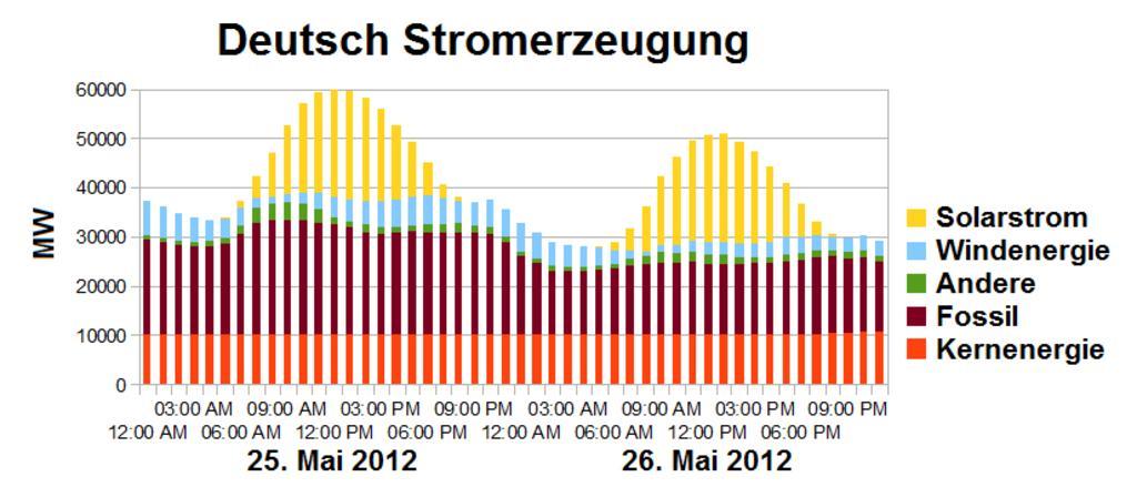 | Keywords: Deutsch Stromerzeugung 25-26-Mai-2012.png de Deutsch Stromerzeugung 25-26-Mai-2012 - 22 000 MW Solarstrom 2012-06-17 own Data is fromhttp //www transparency eex com/en/ one day at a time for actual wind solar and >100MW and then average the quarter hour data for wind and solar to combine it with the >100 MW data and then plotted using Open Office Nuclear is from the previous day datahttp //www transparency eex com/en/Voluntary 20Commitment 20of 20the 20Market 20Participants/Power 20generation/Previous-day-generation and transcribed one value at a time Delphi234 File Germany Electricity Generation 5-25-26-2012 png wikitable Datum Time Kernenergie Fossil Andere Wind Solarstrom - 2012-05-25 12 00 AM 10209 5 19028 6 969 1 6890 1 0 0 - 2012-05-25 01 00 AM 10226 4 18485 0 1014 8 6272 7 0 0 - 2012-05-25 02 00 AM 10211 4 17841 5 947 0 5655 1 0 0 - 2012-05-25 03 00 AM 10204 5 17650 1 940 9 5106 4 0 0 - 2012-05-25 04 00 AM 10209 2 17758 7 1004 5 4582 6 1 0 - 2012-05-25 05 00 AM 10217 8 18159 4 1155 6 4254 4 167 2 - 2012-05-25 06 00 AM 10238 1 20335 3 1550 2 3574 3 1356 9 - 2012-05-25 07 00 AM 10271 2 22508 0 2863 0 2098 9 4341 0 - 2012-05-25 08 00 AM 10274 5 23086 3 3286 8 1412 3 8971 3 - 2012-05-25 09 00 AM 10257 9 23196 4 3405 1 1705 9 13705 9 - 2012-05-25 10 00 AM 10254 8 23058 5 3290 4 2384 7 17553 1 - 2012-05-25 11 00 AM 10247 1 22710 8 2402 7 3464 4 20184 9 - 2012-05-25 12 00 PM 10235 8 22225 2 1575 4 4089 4 21724 3 - 2012-05-25 01 00 PM 10223 6 21753 0 1273 7 4378 4 22152 3 - 2012-05-25 02 00 PM 10217 8 20691 7 1542 8 4856 4 21301 6 - 2012-05-25 03 00 PM 10203 6 20355 8 1530 0 5108 2 19282 3 - 2012-05-25 04 00 PM 10204 9 20517 6 1364 5 5328 6 16058 2 - 2012-05-25 05 00 PM 10192 8 20845 0 1281 1 5800 0 11754 4 - 2012-05-25 06 00 PM 10190 7 20761 7 1527 7 5973 7 6975 8 - 2012-05-25 07 00 PM 10191 1 20540 0 1869 4 5323 6 2969 6 - 2012-05-25 08 00 PM 10201 7 20728 1 1931 1 4435 4 707 6 - 2012-05-25 09 00 PM 10208 4 20563 8 1406 4 4763 1 35 6 - 2012-05-25 10 00 PM 10211 6 20189 7 1640 4 5384 2 0 0 - 2012-05-25 11 00 PM 10195 6 18598 4 1203 6 5610 1 0 0 - 2012-05-26 12 00 AM 10159 6 15950 7 999 8 5800 0 0 0 - 2012-05-26 01 00 AM 10142 0 14446 4 941 1 5372 6 0 0 - 2012-05-26 02 00 AM 10147 2 12904 1 941 0 4669 3 0 0 - 2012-05-26 03 00 AM 10159 5 12704 2 1028 3 4298 6 0 0 - 2012-05-26 04 00 AM 10162 5 12725 9 1003 6 4119 2 1 0 - 2012-05-26 05 00 AM 10157 1 13033 0 821 3 3626 3 175 9 - 2012-05-26 06 00 AM 10173 9 13217 9 1116 5 2856 8 1392 4 - 2012-05-26 07 00 AM 10188 5 13926 6 1591 5 1535 9 4433 3 - 2012-05-26 08 00 AM 10186 4 14352 9 1604 4 778 4 9141 4 - 2012-05-26 09 00 AM 10174 8 14657 7 2242 4 1127 3 13994 3 - 2012-05-26 10 00 AM 10168 6 14402 9 2015 2 1645 7 17947 6 - 2012-05-26 11 00 AM 10148 5 14713 1 2116 9 2002 0 20519 3 - 2012-05-26 12 00 PM 10138 3 14301 4 2007 6 2336 1 21811 0 - 2012-05-26 01 00 PM 10136 3 14218 2 2068 6 2433 0 21914 2 - 2012-05-26 02 00 PM 10127 4 14238 2 1421 9 2621 5 20867 7 - 2012-05-26 03 00 PM 10121 3 14497 3 1216 9 2759 7 18684 2 - 2012-05-26 04 00 PM 10117 3 14551 3 1198 6 2953 9 15359 8 - 2012-05-26 05 00 PM 10103 2 14915 4 1526 9 3277 8 11099 1 - 2012-05-26 06 00 PM 10095 9 15224 8 1490 1 3135 7 6592 6 - 2012-05-26 07 00 PM 10095 2 15760 4 1481 2 2884 9 2885 1 - 2012-05-26 08 00 PM 10294 5 15754 7 1391 2 2382 6 748 0 - 2012-05-26 09 00 PM 10519 3 15188 1 1240 2 2634 9 41 6 - 2012-05-26 10 00 PM 10810 0 14979 2 1458 7 2951 9 0 0 - 2012-05-26 11 00 PM 10671 3 14387 9 1157 2 2922 7 0 0 cc-zero Uploaded with UploadWizard Solar energy in Germany Renewable energy statistics of Germany |