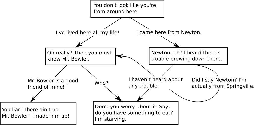 | Keywords: Dialog tree example.svg en Example of a dialog tree or conversation tree depicting a fictional conversation between a player character and a non-player character Not taken from any actual game own Dcoetzee <gallery>Dialog tree example sv svg Swedish translation</gallery> Cc-zero Interactive fiction Gameplay |