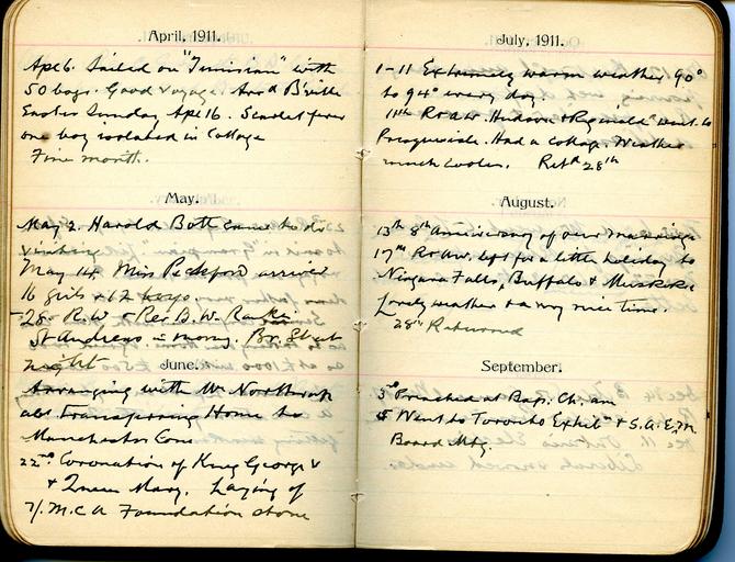 | Keywords: 1880s 1890s 1900s 1910s 1920s diaries home children homechildren April 1911 April 6th, Sailed on "Tunisian" with 50 boys. Good voyage. Arrived Belleville Easter Sunday April 16th, Scarlet fever, one boy isolated in cottage five months May 1911 May 2nd, Harold Both came to do Visiting May 14th, Miss Pickford arrived 16 girls & 12 boys May 28th, RW & Rev B W Ranki, St Andrews in morning. Bridge Street at night. Arranging with Mr Northwork about transposing Home to Manchester Co 22nd, Coronation of King George V & Queen May. Laying of YMCA Foundation Stone July 1911 July 1 - 11 Extremely warm weather 90 degrees to 94 degrees every day 11th, R & AW, Hudson & Reginald went to Presquisle. Had a cottage. Weather much cooler. Returned 28th. August 1911 Aug. 13th, The 8th anniversary of our marriage 17th, R & A W left for a little holiday to Niagara Falls, Buffalo & Muskoka. Lovely weather & a very nice time, 28th returned. September 1911 Sept. 3rd, Preached at Bap. Church a.m. 5th Went to Toronto Exhibition & S.A.E. Board meeting April 1911 April 6th, Sailed on "Tunisian" with 50 boys. Good voyage. Arrived Belleville Easter Sunday April 16th, Scarlet fever, one boy isolated in cottage five months May 1911 May 2nd, Harold Both came to do Visiting May 14th, Miss Pickford arrived 16 girls & 12 boys May 28th, RW & Rev B W Ranki, St Andrews in morning. Bridge Street at night. Arranging with Mr Northwork about transposing Home to Manchester Co 22nd, Coronation of King George V & Queen May. Laying of YMCA Foundation Stone July 1911 July 1 - 11 Extremely warm weather 90 degrees to 94 degrees every day 11th, R & AW, Hudson & Reginald went to Presquisle. Had a cottage. Weather much cooler. Returned 28th. August 1911 Aug. 13th, The 8th anniversary of our marriage 17th, R & A W left for a little holiday to Niagara Falls, Buffalo & Muskoka. Lovely weather & a very nice time, 28th returned. September 1911 Sept. 3rd, Preached at Bap. Church a.m. 5th Went to Toronto Exhibition & S.A.E. Board meeting |