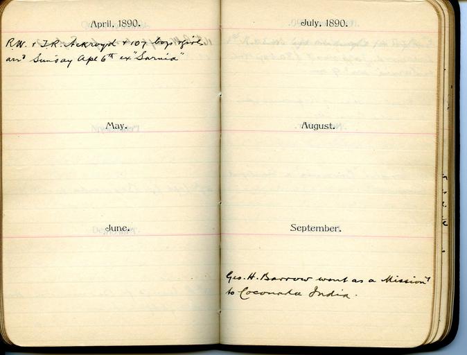 | Keywords: 1880s 1890s 1900s 1910s 1920s diaries home children homechildren April 1890 Apr. 6th, R W & T R Ackroyd & 107 boys & girls arrived Sunday, on the "Sarnia" September 1890 George H Barrow went as a Missionary to Coconada, India April 1890 Apr. 6th, R W & T R Ackroyd & 107 boys & girls arrived Sunday, on the "Sarnia" September 1890 George H Barrow went as a Missionary to Coconada, India | ||||