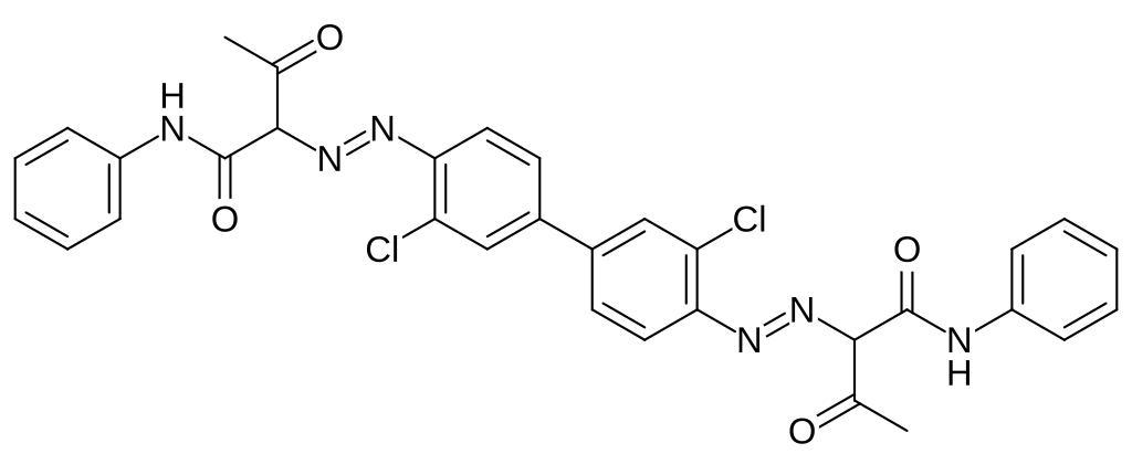 Keywords: Diarylide yellow.svg Chemical structure of AAA diarylide yellow C I Pigment Yellow 12 Own 16 23 10 February 2014 UTC Ed Edgar181 Azo dyes Pigments Un-N-substituted anilides