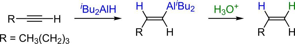 Keywords: DIBAL example 1.svg Scheme of a reaction of hex-1-yn with DIBAL and then with an acid Own 2007-09-13 Calvero Organic syntheses
